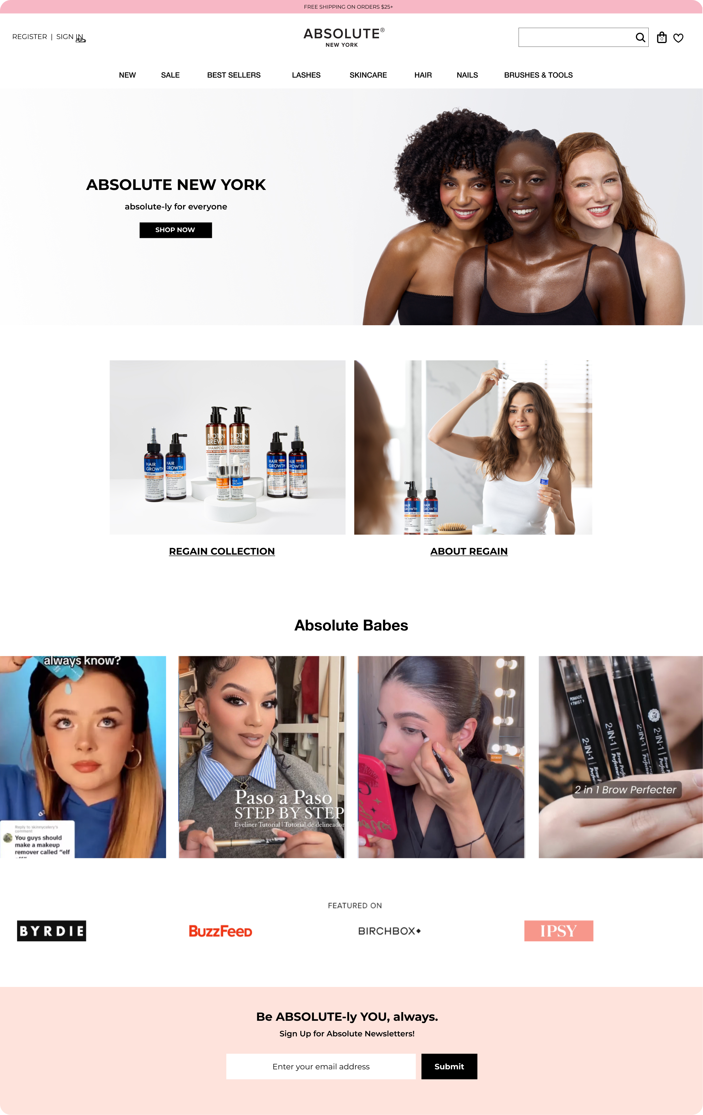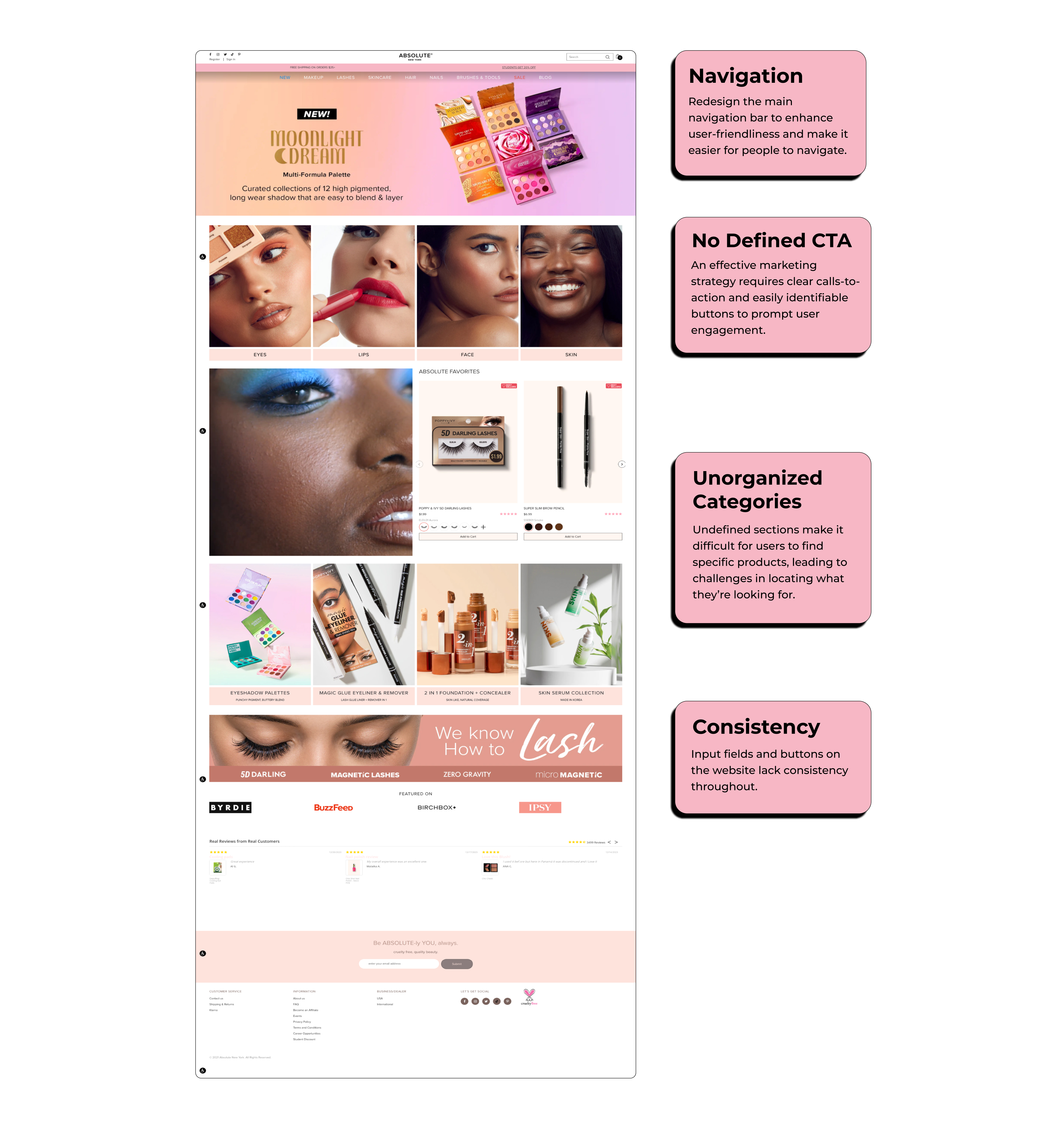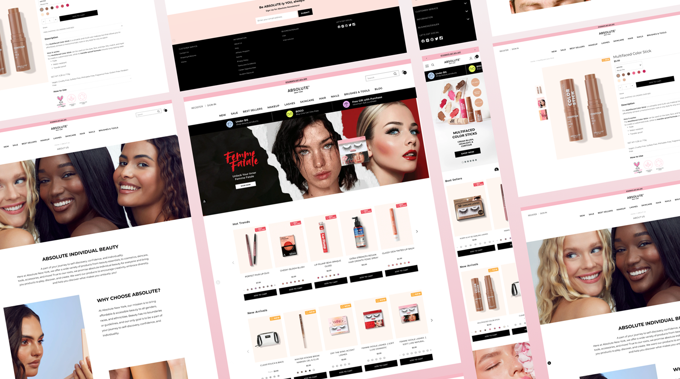 Absolute New York had a strong presence in beauty supply stores but lacked focus on online marketing, leaving their website outdated since 2019. Post-pandemic, they recognized the importance of enhancing their online platform. The outdated design was misaligned with current trends and struggled to attract consumers, prompting a full redesign and update.